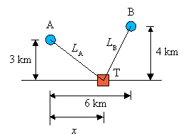 Zwei Ortschaften A und B sollen eine Hochspannungsleitung mit elektrischer Energie versorgt werden. Die Entfernungen der Orte von der Leitung und voneinander sind der Zeichnung zu entnehmen. Wenn nur ein Transformator T benutzt wird, um die Hochspannung auf die benötigte Mittelspannung herabzusetzen, müssen zwei geradlinige Leitungen der Längen LA bzw. LB von T zu A bzw. zu B gelegt werden.