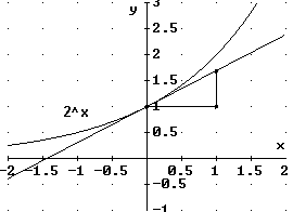 Gibt es eine Basis a, für die das zutrifft? Der Grenzwert bedeutet ja die Ableitung der Exponentialfunktion zur Basis a an der Stelle x = 0. Es ist also nach einer Exponentialfunktion zu suchen, für die die Tangente an den Graphen bei x = 0 die Steigung 1, also den Steigungswinkel 45° hat.