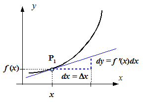 Dabei werden dy (bzw. df) und dx als Differentiale bezeichnet. Die Ableitung wird daher auch Differentialquotient genannt. Die geometrische Bedeutung der Differentiale ist der folgenden Abbildung zu entnehmen: dy ist der Zuwachs der Tangente, wenn x um dx wächst.