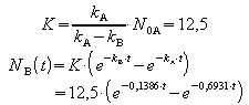 a) Eine radioaktive Substanz A hat zur Zeit t = 0 den Anfangswert von N0A = 10 Mengeneinheiten. Sie zerfällt mit der Halbwertszeit tHA = 1 Stunde in eine Substanz B. Die Substanz B ist ebenfalls radioaktiv und zerfällt mit der Halbwertszeit tHB = 5 Stunden. Wie lautet die Wachstumsfunktion für NB(t)?