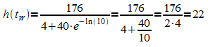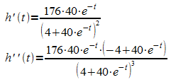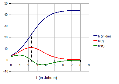 Der Verlauf des Graphen lässt vermuten, dass die Änderungsrate von h, also die Wachstumsgeschwindigkeit, einen maximalen Wert besitzt. Der zugehörige Zeitpunkt tW ist dann eine Wendestelle von h. Die Ermittlung dieser Wendestelle kann in gewohnter Weise erfolgen. Unter Verwendung von Quotienten- und Kettenregel ergibt sich: