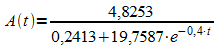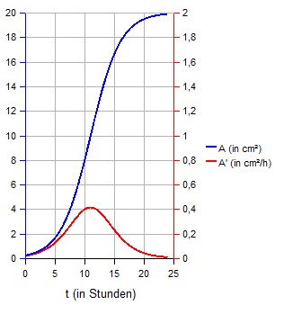 1. Eine Bakterienkultur wächst logistisch mit k = 0,02 und bedeckt eine Fläche A(t). Dabei ist t die Zeit ab Beobachtungsbeginn gemessen in Stunden. Nach 10 Stunden beträgt die bedeckte Fläche 8 cm2. Die Sättigungsgrenze ist S = 20 cm2.
