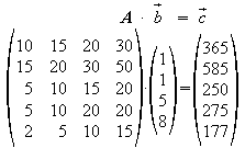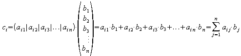 Ein Element des Produktionsvektors ergibt sich also, indem die Elemente der entsprechenden Zeile der Modellmatrix mit den Elementen des Bestellvektors multipliziert und die einzelnen Produkte addiert werden. Diese Rechenoperation wird als Skalarprodukt des Zeilenvektors der Matrix mit dem Spaltenvektor bezeichnet.