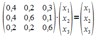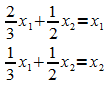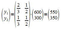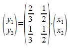 Die Anzahl der Wahlen von A am ersten Tag wird mit x1 bezeichnet, die Anzahl am zweiten Tag mit y1. Entsprechend werden die Anzahlen der Wahlen von B mit x2 bzw. y2 bezeichnet. Der Übergang von einem Tag zum nächsten wird dann durch folgende Gleichung beschrieben:
