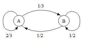 1. In einer Betriebskantine werden mittags zwei Arten von Gerichten angeboten: A: fleischhaltig, B: rein vegetarisch. Die Gäste der Kantine zeigen folgendes Verhalten: Von den Gästen, die das Gericht der Art A gewählt haben, wählen beim nächsten Ma(h)l zwei Drittel wieder das Gericht der Art A, während ein Drittel zum Gericht der Art B wechselt. Gäste, die B gewählt haben, wechseln beim nächsten Mal zur Hälfte zu A, während die andere Hälfte wieder B wählt. Im Folgenden wird vorausgesetzt, dass sich von einem Tag zum nächsten die Anzahl der Gäste nicht verändert.
