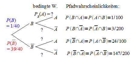 Die Pfadwahrscheinlichkeiten stimmen in beiden Baumdiagrammen bis auf die Reihenfolge überein. Die noch fehlenden bedingten Wahrscheinlichkeiten sind wie folgt mit den Daten des ursprünglichen Baumdiagramms zu ermitteln: