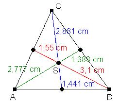 Eine Seitenhalbierende verbindet einen Eckpunkt des Dreiecks mit dem Mittelpunkt der gegenüberliegenden Seite. Die Seitenhalbierenden im Dreieck schneiden sich in einem Punkt. Dies ist der Schwerpunkt S des Dreiecks. Der Schwerpunkt teilt die Seitenhalbierenden im Verhältnis 1:2. |