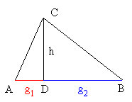 Die Berechnung des Flächeninhalts eines nicht-rechtwinkligen Dreiecks wird auf das rechtwinklige Dreieck zurückgeführt. Die Höhe h zerlegt das Dreieck ABC in zwei rechtwinklige Dreiecke CAD und BCD. Damit ergibt sich: ![]()