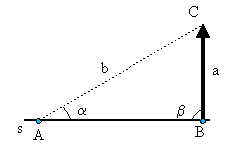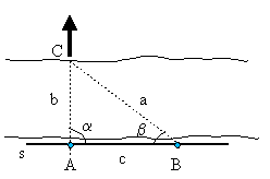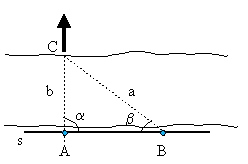 Zuerst wird eine Standlinie s abgesteckt. Von s aus wird ein markanter Punkt C auf dem gegenüberliegenden Ufer unter dem Winkel a = 90° zur Standlinie angepeilt und so der Punkt A festgelegt. Von einem weiteren Punkt B auf der Standlinie wird wieder C angepeilt und der Winkel b sowie die Länge der Strecke AB gemessen. Mit diesen Daten kann jetzt ein maßstabsgerechtes Dreieck gezeichnet und die Flussbreite b näherungsweise bestimmt werden. |