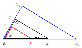 Ein rechtwinkliges Dreieck ABC wird unter Beibehaltung der Winkelgrößen vergrößert (Dreieck AB2C2) bzw. verkleinert (Dreieck AB1C1):