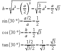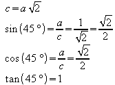 Für spezielle Winkel lassen sich die Winkelfunktionswerte leicht berechnen. So gilt im gleichschenklig-rechtwinkligen Dreieck: | |