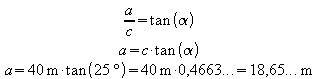 Die Standlinie wird rechtwinklig zur zu bestimmenden Höhe gezogen. Von einem Punkt A der Standlinie aus wird der höchste Punkt C unter einem Winkel a angepeilt und die Länge der Strecke AB gemessen. Damit kann wieder ein maßstabsgerechtes Dreieck gezeichnet und die Höhe a näherungsweise bestimmt werden. |