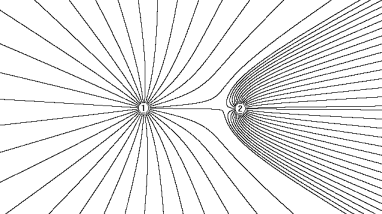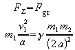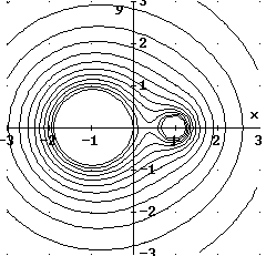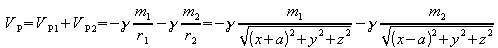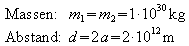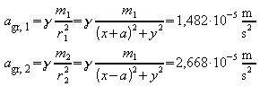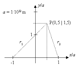 Die beiden Sterne werden gemäß der nebenstehenden Abbildung symmetrisch in einem Koordinatensystem angeordnet. In jedem Punkt des Raumes überlagern sich die Gravitationsfelder der beiden Massen. Die resultierende Feldstärke in einem Punkt P ergibt sich aus der vektoriellen Summe der Einzelfeldstärken: