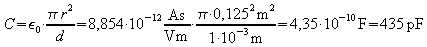 Beispiel: Für kreisförmige Platten mit Radius r = 12,5 cm und Abstand d = 1 mm ergibt sich eine Kapazität von