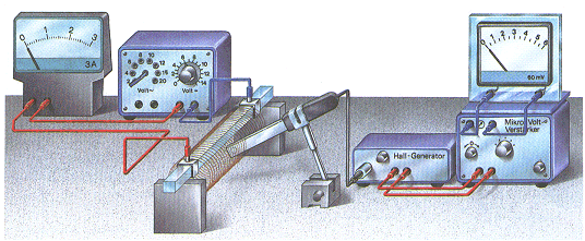 Die Flussdichte B kann leicht mit einer Hallsonde in folgendem Aufbau gemessen werden: