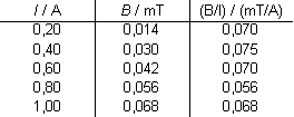 Der Messwert weicht davon recht stark ab. Der Hauptgrund dafür dürfte in einer leichten Schrägstellung der Hallsonde zu suchen sein, so dass das Magnetfeld die Hallsonde nicht rechtwinklig durchsetzt. Dadurch wird die Flussdichte B zu klein gemessen und damit ergibt sich auch ein zu kleiner Wert der magnetischen Feldkonstante.