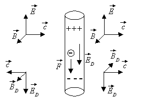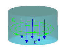 Die hochfrequente Umladung des Kondensators induziert Ströme in der Zylinderwand. Das E-Feld verläuft in axialer Richtung und wird vom B-Feld in konzentrischen Kreisen umwirbelt. |