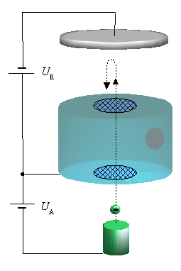 Deckel und Boden enthalten Gitter, durch die ein Elektronenstrahl durch den Resonator hindurchtreten kann. Der Elektronenstrahl wird mit einer Glükathode und einer Beschleunigungsspannung UA erzeugt. Nach dem Durchlaufen des Hohlraumresonators laufen die Elektronen gegen die Spannung eines Reflektors UR an und kehren ihre Bewegungsrichtung um. |