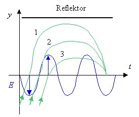 Wenn die Reflektorspannung den richtigen Wert aufweist, treffen die Elektronen so im Resonator ein, dass sie vom E-Feld abgebremst werden. Sie geben dann einen Teil ihrer kinetischen Energie an das elektrische Wechselfeld ab. Durch diese Energiezufuhr zum Feld wird die Schwingung aufrecht erhalten.