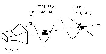 Empfänger 2 reagiert. In dieser Stellung des Gitters wird die Mikrowellenstrahlung also abgeschirmt und reflektiert. Damit ist auch nachgewiesen, dass die Mikrowellenstrahlung linear polarisiert ist. |