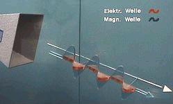 2. Im folgenden Bild eines Mikrowellensenders sind die Schwingungsebenen von elektrischem und magnetischem Feld der elektromagnetischen Welle eingezeichnet. Das B-Feld schwingt in der Bildebene, das E-Feld senkrecht dazu.