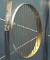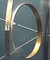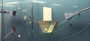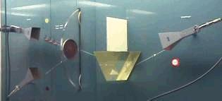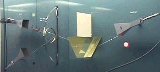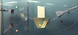 Durch ein Loch in der Resonatorwand wird die elektromagnetische Welle aus dem Klystron in einen Hohlleiter ausgekoppelt und zu einer Hornantenne geleitet, von der sie dann abgestrahlt wird.