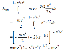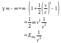 Dieser Ausdruck für die kinetische Energie besteht aus zwei Termen. Der erste hängt von der Geschwindigkeit u des Massenpunktes ab, während der zweite Term mc2 unabhängig von der Geschwindigkeit ist und Ruheenergie E0 des Massenpunktes heißt: