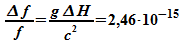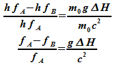 Dies ist eine Verschiebung zum roten Ende des Spektrums. Daher wird dieser Effekt als Gravitationsrotverschiebung bezeichnet. Diese Verschiebung von Spektrallinien lässt sich an Licht, das von der Sonne ausgeht, nachweisen. Der erste Nachweis auf der Erde wurde 1962/65 von Pound, Rebka und Snider durchgeführt. Bei einem Höhenunterschied von DH = 22,6 m ergab sich der nach der Theorie erwartete Wert für die relative Frequenzänderung:
