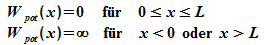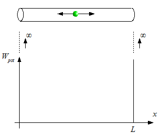 Ein Teilchen, z.B. ein Elektron, ist in einem lang gestreckten Körper der Länge L eingeschlossen. Im Innern des Körpers kann sich das Teilchen frei bewegen. Die potentielle Energie ist also konstant, und ihr Wert kann auf Wpot = 0 festgelegt werden. Weiter soll das Teilchen nicht in die Begrenzungen des Körpers eindringen können, d.h. Wpot wird dort unendlich groß. Der Verlauf der potentiellen Energie hat also die Form eines (unendlich hohen) Topfes, daher die Bezeichnung des Modells als linearer Potentialtopf.